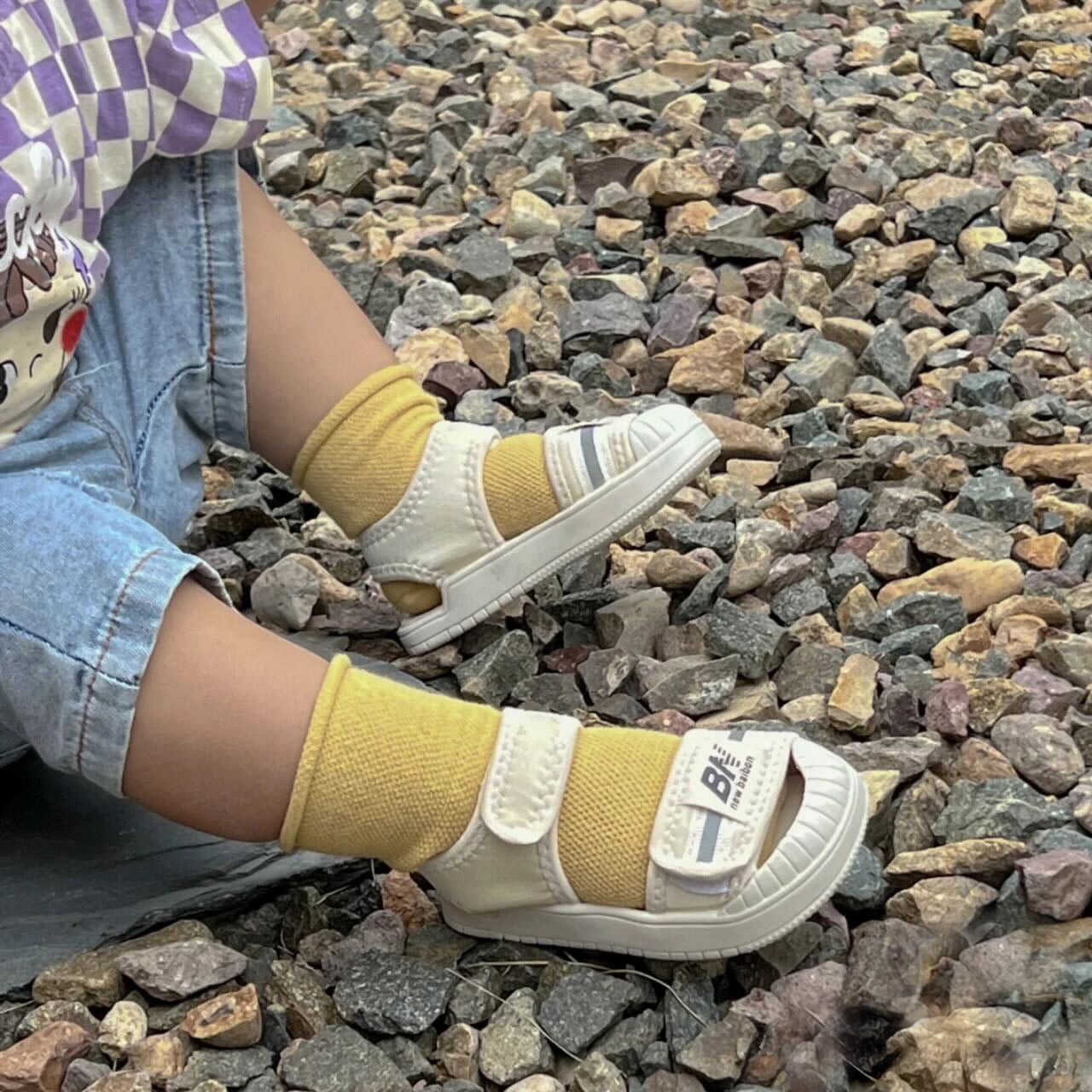 ▼黃色襪子搭配白色的涼鞋,很普通很簡單的搭配,穿在寶寶身上卻很時髦。