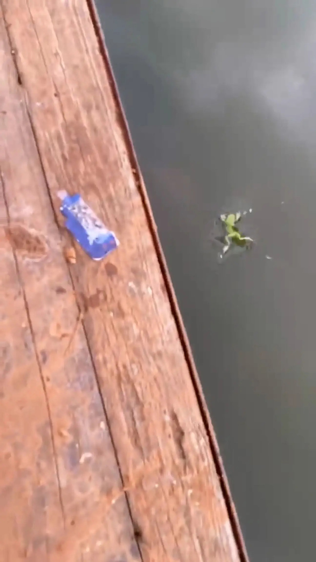 2023年07月13日大自然就是這麼無情~日前中國遼寧大連一位爸爸帶兒子去河邊放生小青蛙,爸爸本想教孩子珍惜生命,沒想到小青蛙被放生後不久,就被河中的大魚一口吞掉。爸爸超尷尬,無奈說:「這哪是放生啊,這是餵食!」旁邊的兒子也無語了。