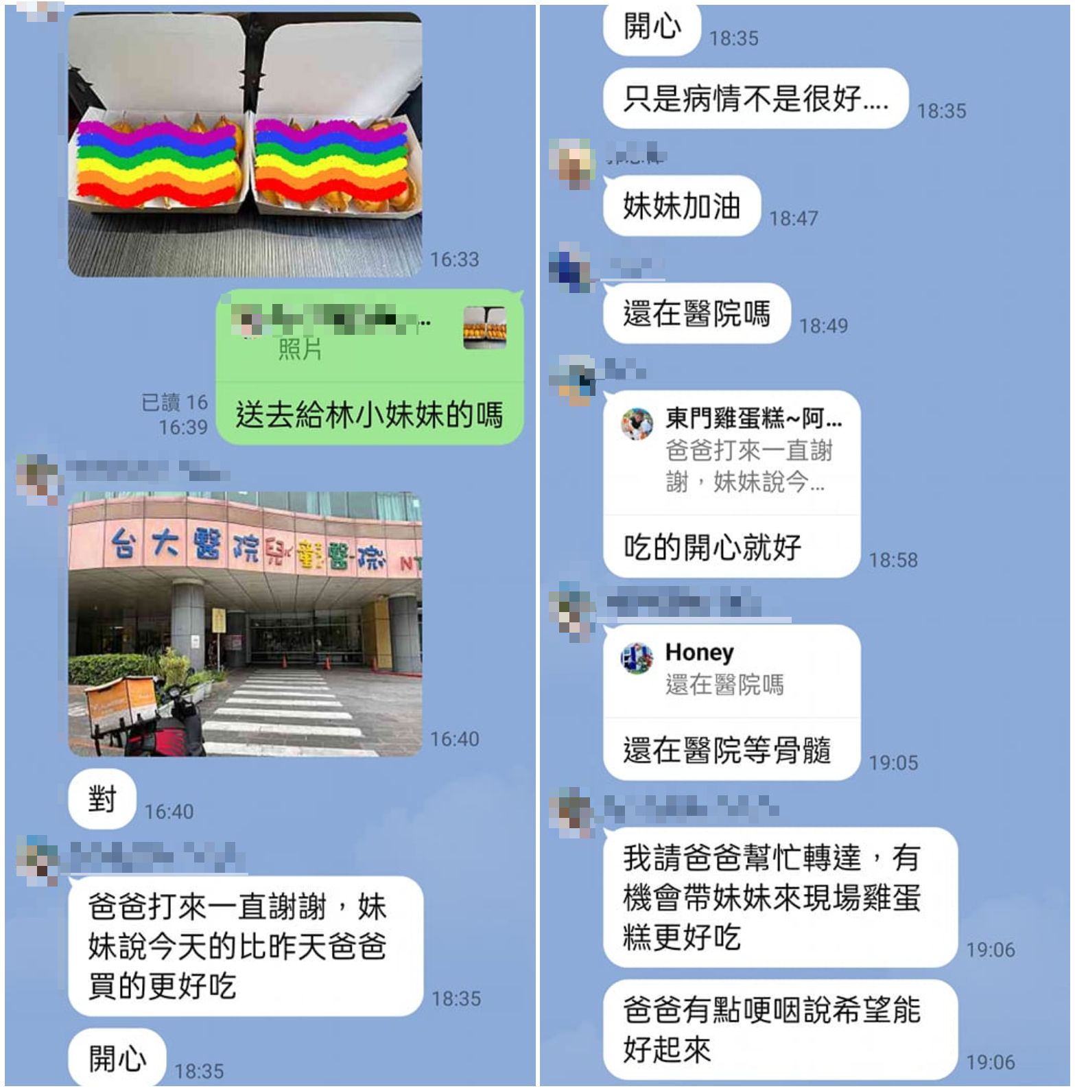 ▼一名網友在臉書社團「爆怨公社」分享LINE截圖對話,她透露一名從嘉義來的年輕爸爸多次帶罹癌的女兒到台大醫院兒童醫院治療,同病房的病友曾請林小妹吃過永康街的雞蛋糕,之後林小妹就對這味道念念不忘。這次父女兩人再次來台北,林小妹就指定要吃永康街的雞蛋糕。