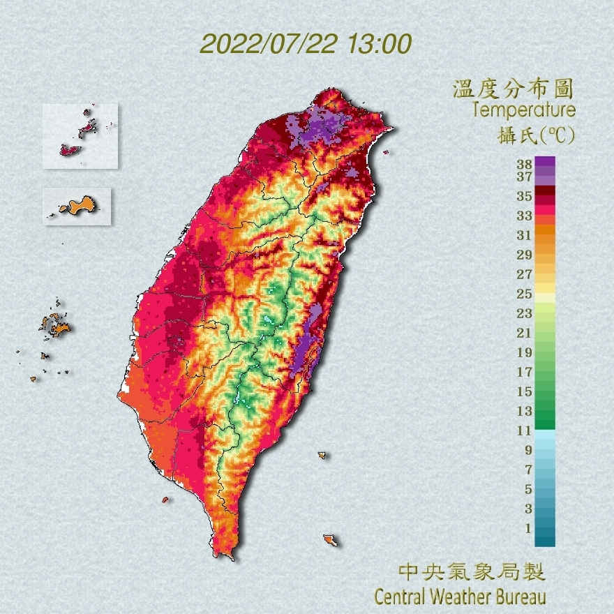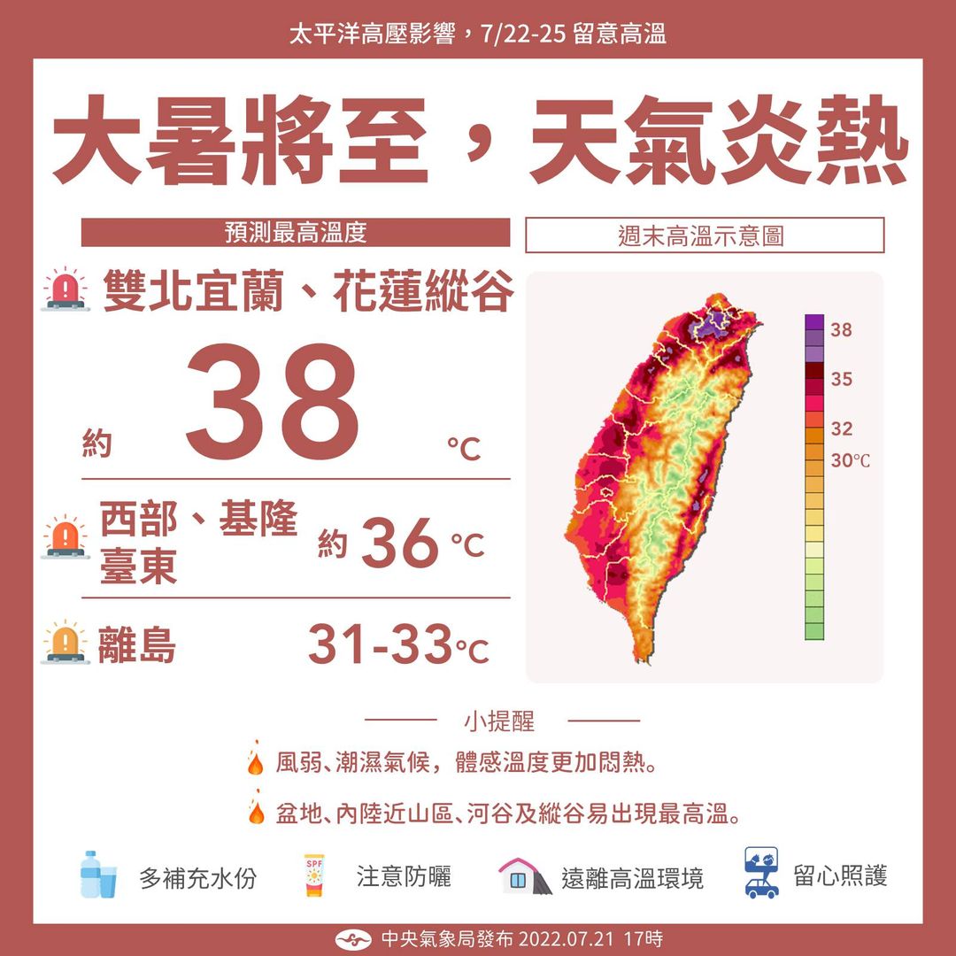 2022年07月22日受太平洋高壓影響,今天(22日)台灣各地及澎湖、金門、馬祖大多為晴到多雲且高溫炎熱,午後各地山區有零星短暫雷陣雨。氣象專家提醒,週末還會更熱,氣象局預估,台北市下週日、週一體感溫度甚至能達到43度,一定要注意防暑!