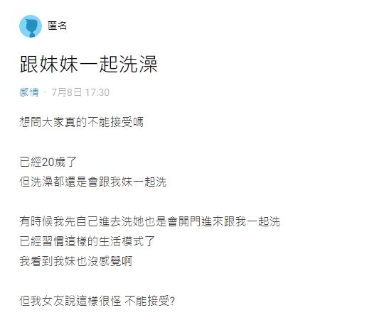 ▼這名男網友在Dcard上發文說,自己今年已經20歲,但在家洗澡時不會特別鎖門,也不會跟妹妹分開洗澡。有時他先進浴室,妹妹會自己開門進來和他一起洗。女友得知後表示不能接受,但原po已經習慣這樣的生活模式,還說「看到我妹也沒感覺」。他詢問網友:「大家真的不能接受嗎?」
