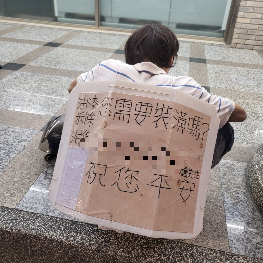2022年08月03日日前有民眾經過新北土城某路段時,看到一名男子坐在路邊,背後掛著寫有 「油漆、拆除、泥作,您需要裝潢嗎」的廣告看板,為自己爭取工作機會,讓人看了很心疼。她決定po上網幫忙宣傳:「覺得每個認真生活的人都需要機會,看各位老闆有沒有需求囉。」