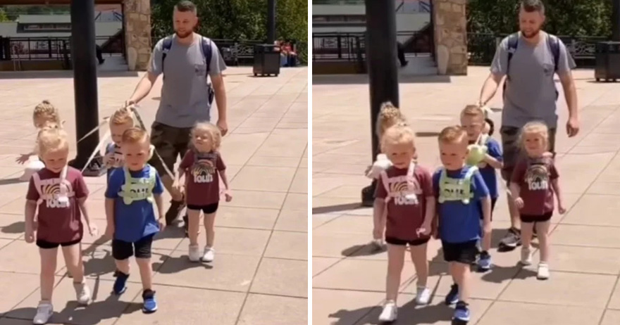 2022年08月08日美國肯塔基州(Kentucky)31歲男子Jordan Driskell是5個小孩的爸爸。最近他帶5胞胎外出散步的影片在網路上引發討論。從影片中可以看到,Jordan給小孩們準備了防走失包,他牽著繩子的一端走在後面,5個孩子則走在前面。一些網友看到影片後批評說:「根本是把小孩當狗遛!」