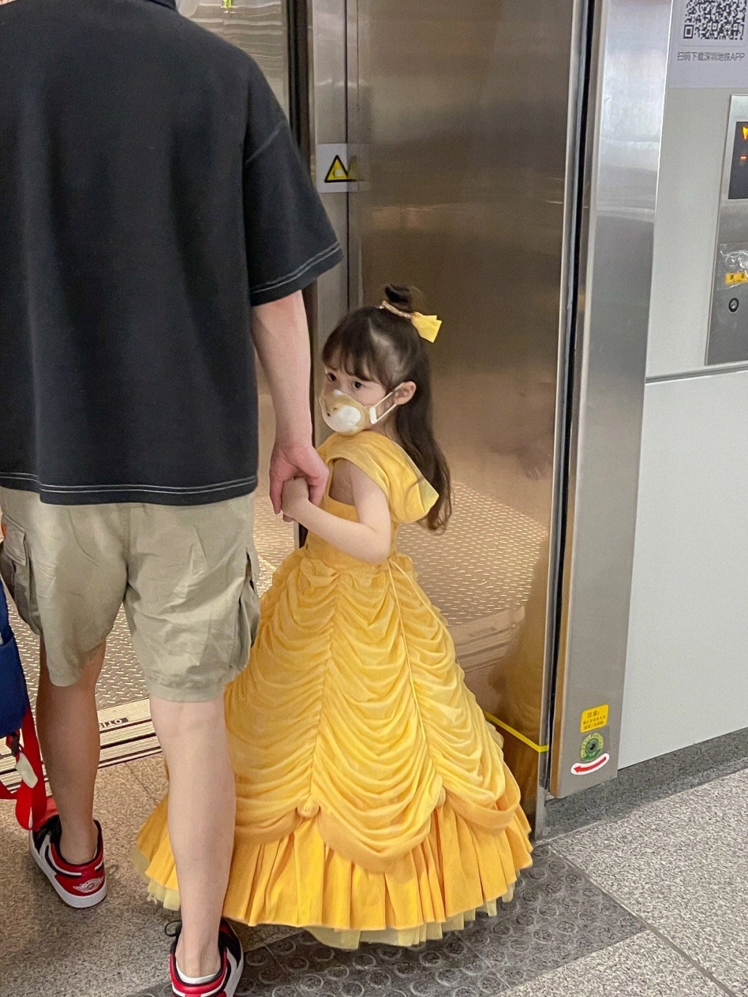 ▼小紅書帳號「@阿NO阿NO」經常會分享這個小女孩的變裝照。最近小女孩裝扮成貝兒公主,出現在地鐵上的照片在網路上引發話題。只見她身穿貝兒公主的黃色禮服,頭髮也梳成甜美的公主頭,整體看起來非常可愛。雖然她戴著口罩,但能看到又大又亮的眼睛,還有精緻的小臉蛋。