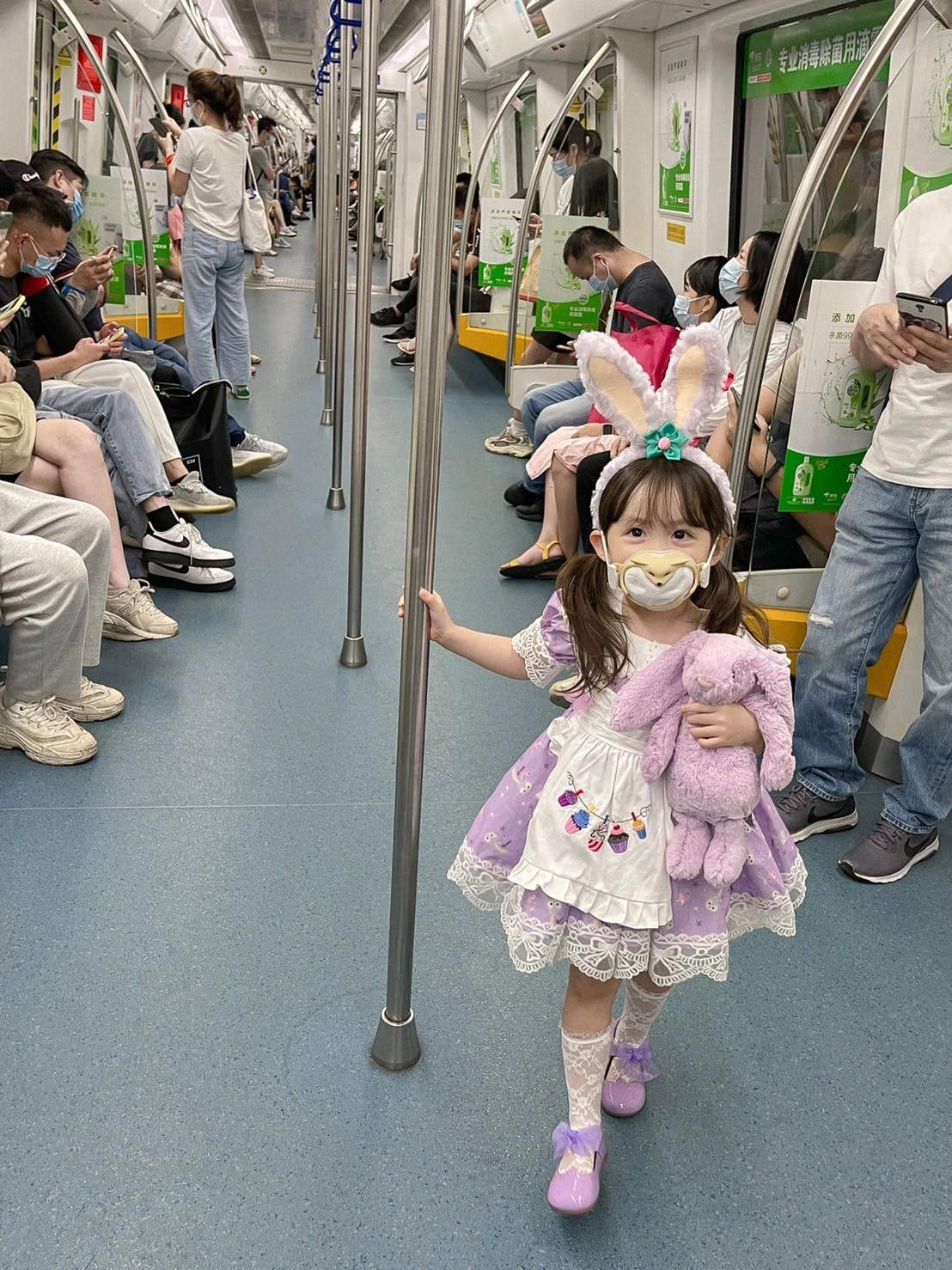 ▼小公主搭地鐵,感覺普通的背景都變得夢幻起來。很多人好奇這個小女孩摘下口罩是什麼模樣,應該同樣可愛吧?