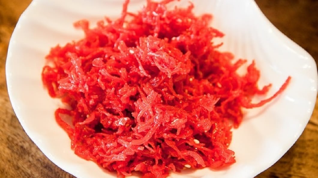 除了「豆棗」之外,還有另外一種「紅紅甜甜的」、常會搭配稀飯吃的食物。這種食物的顏色是鮮紅色,形狀是細絲狀,吃壽司時經常會看到它。這種食物台語唸「ㄉㄠˇㄍㄧ」,中文叫做「豆枝」。很多民眾經常將這2種食物搞混,其實兩者的外觀還是有很大不同的~