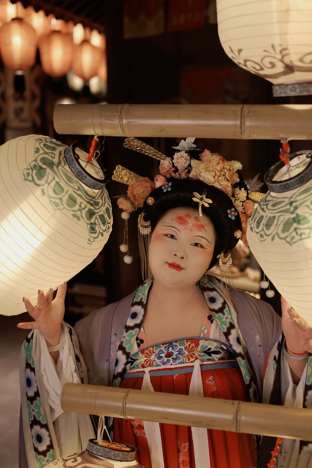 ▼2019年時,王宇第一次穿漢服,朋友們都說她很像現實版的楊貴妃,她就開玩笑給自己起了一個「楊貴肥」的名字。現在王宇在西安唐風市井生活體驗街區開了一間唐代點心文化店鋪,每天下午都會為遊客表演唐代點心的製作,並展示書法。