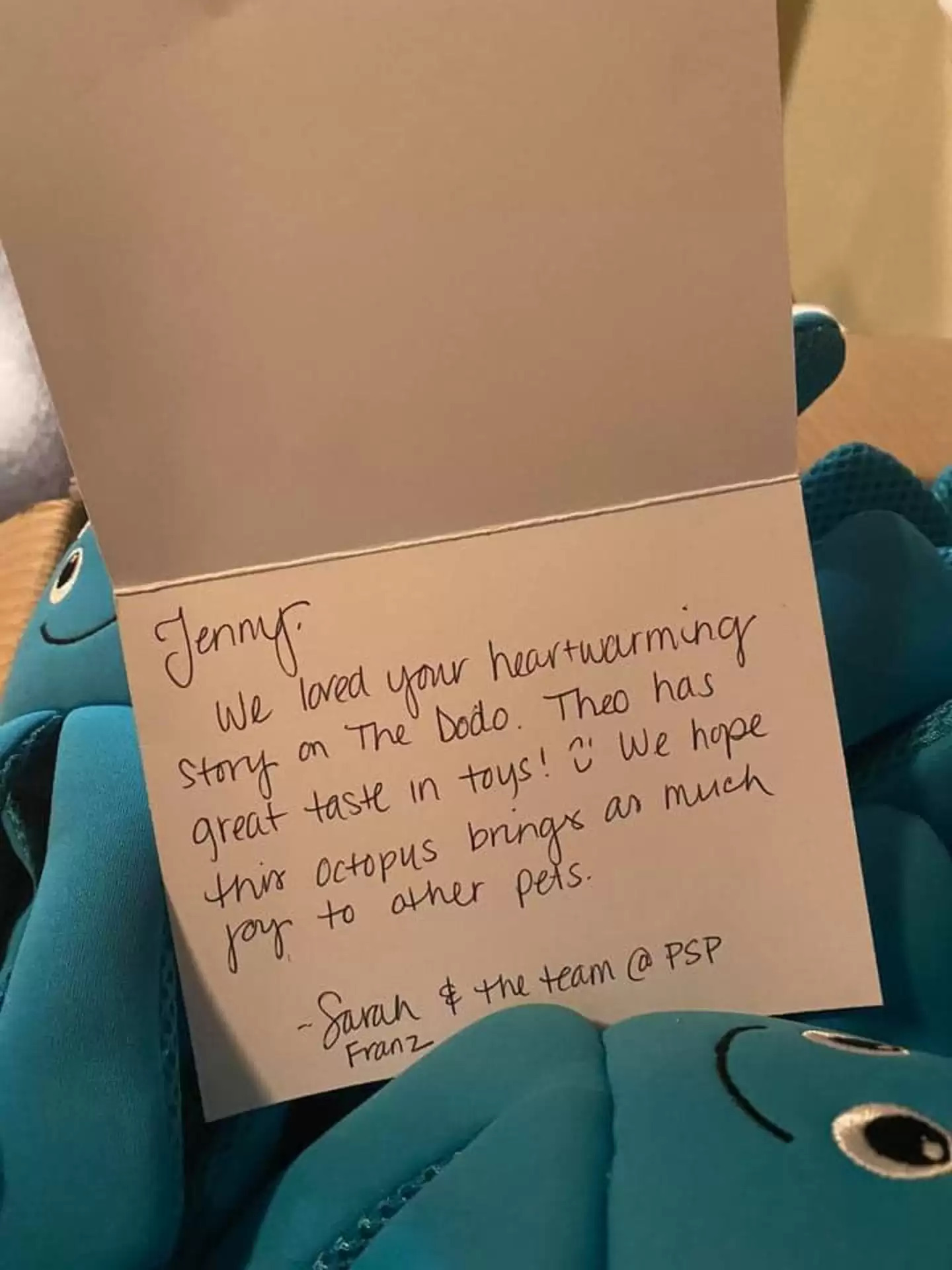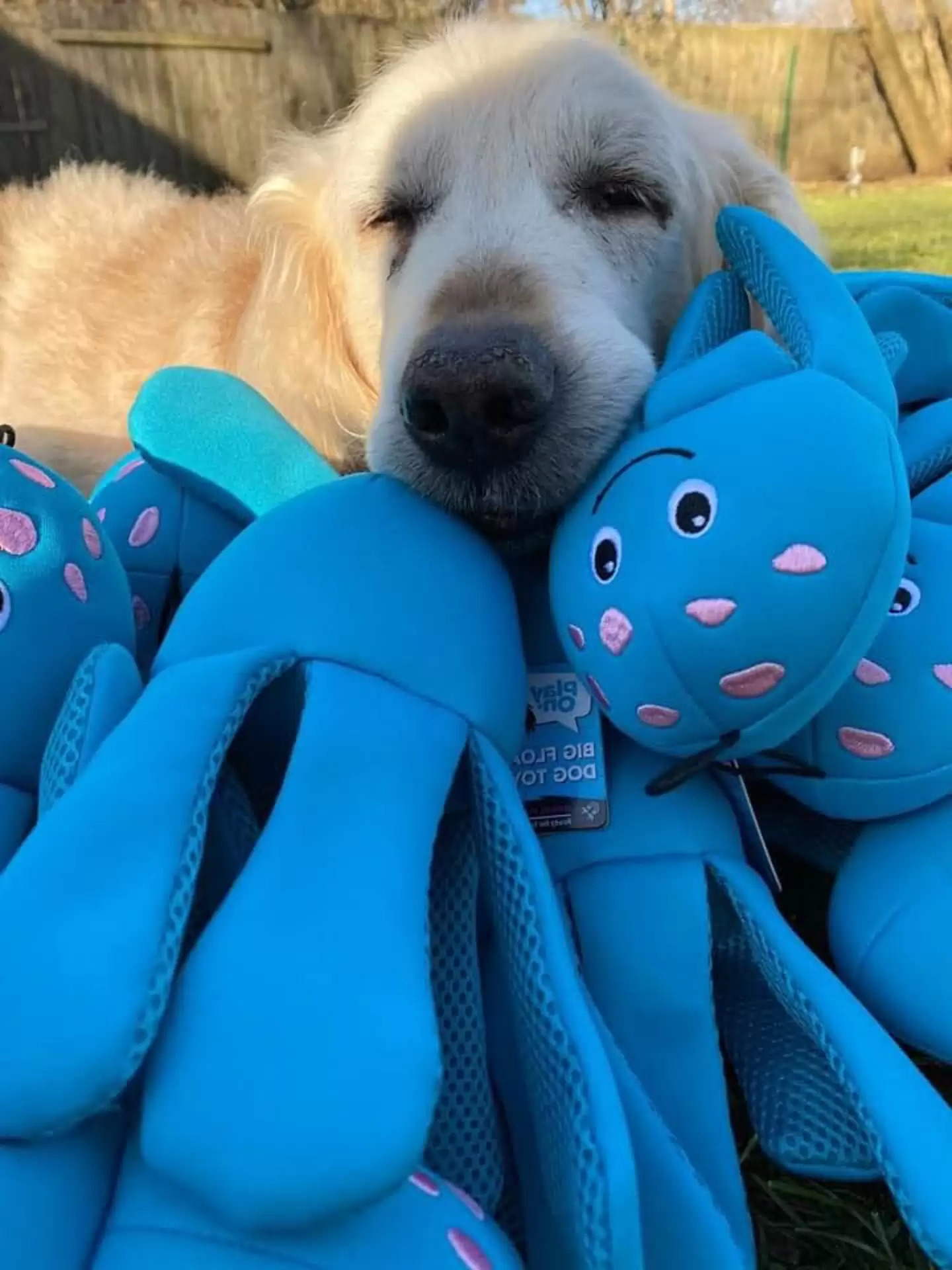 ▼Jenny知道章魚玩偶給Theo的老年生活帶來了巨大的慰藉,她希望能將這份愛傳遞下去,但章魚玩偶是期間限定商品,售罄後就不會再生產。Jenny的一位朋友聯絡玩具生長廠商說明情況,希望能擁有更多章魚玩偶,送給其他罹癌的狗狗。廠商立刻聯絡全美的寵物店,將庫存的所有章魚玩偶全部寄給了Theo。