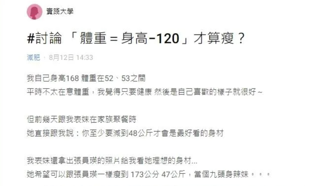 ▼原po在Dcard上以「『體重=身高−120』才算瘦?」為題發文,表示自己身高168公分,體重在52到53公斤之間,平時不太在意體重,覺得只要健康、是自己喜歡的樣子就好。「前幾天跟我表妹在家族聚餐時,她直接跟我說:『妳至少要減到48公斤,才會是最好看的身材』。」
