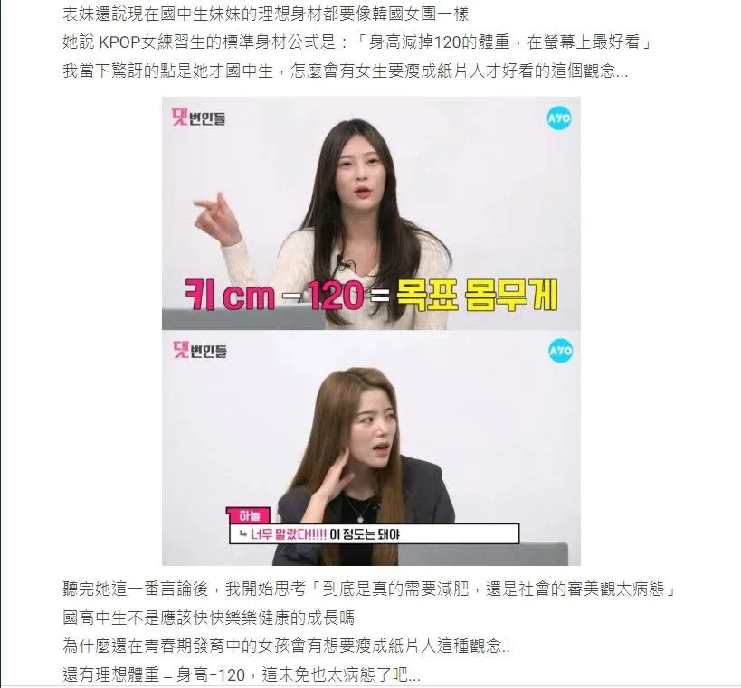 ▼表妹秀出一名韓國女偶像的照片,表示這位女偶像身高173公分、體重47公斤,是自己的理想身材,還說現在的國中妹都想跟韓國女團偶像一樣瘦,「KPOP女練習生的標準身材公式是:『身高減掉120的體重,在螢幕上最好看』」。