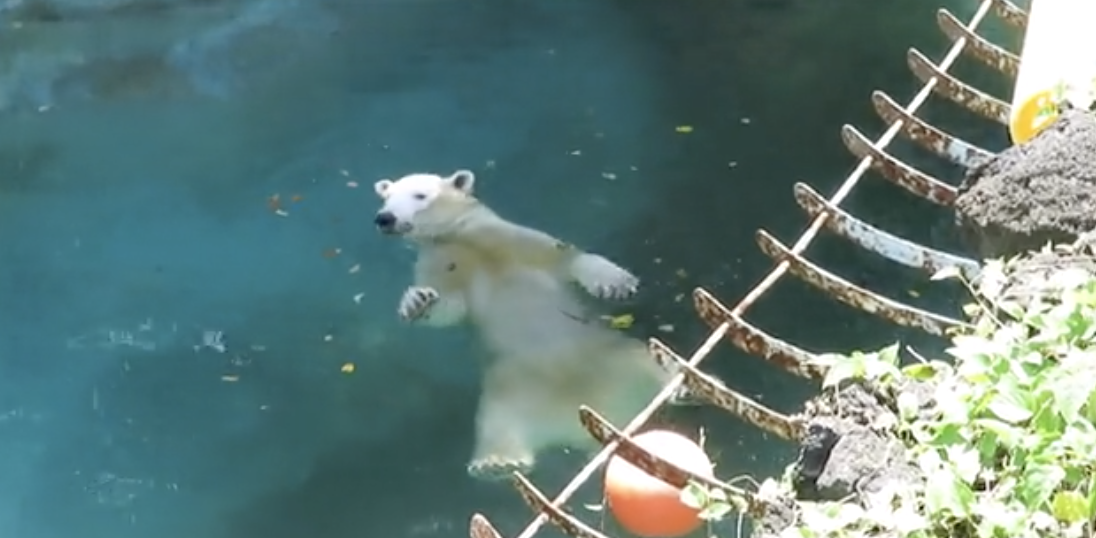 ▼推特網友@RumiDonald非常喜歡北極熊,經常分享去不同動物園拍到的北極熊照片和影片。日前他到大阪天王寺動物園遊玩時,拍到了園區中的明星北極熊「霍烏(ホウちゃん)」玩水消暑的畫面。