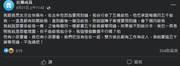 這名女網友在臉書社團「匿名2公社」發文說,去年時男友要用錢,她就拿了5萬給他。「他也承諾每個月5000給我,一直是都有如期給我,直到最後一筆沒給我,他說這陣子家裡要用到錢,會下個月給我。」