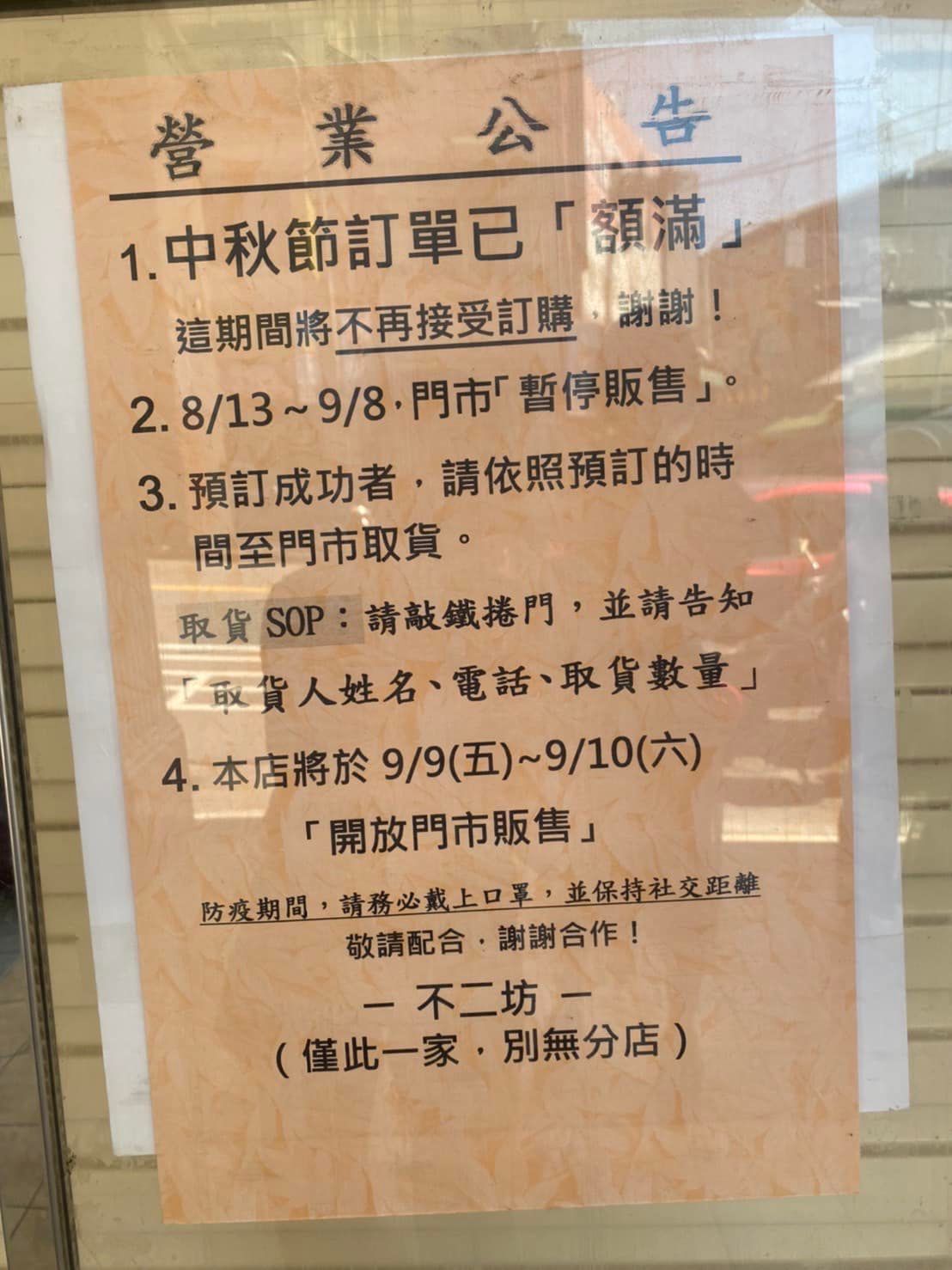 日前不二坊在門口公告,9月9日、10日兩天開放門市販售,有需要的民眾可以選擇這兩天前往購買,屆時現場門市1人只開放限購30顆。