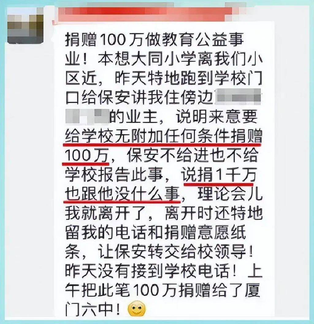 ▼當地媒體向廈門六中查證,該校的工作人員證實,確實有接到這筆100萬元的捐款,但詳細情形不方便透露。這件事被媒體報導後,迅速在網路上引發討論,大同小學的校長也親自傳訊給謝先生致歉:「從網路上看到了您在業主群中發的訊息,方知您近日來過我校,並有捐贈的意向。也特向您致歉,因學校保安人員工作失誤,將字條遺失,且未將訊息及時告知我,辜負了您這份愛心。雖錯過,但這份心意彌足珍貴!」