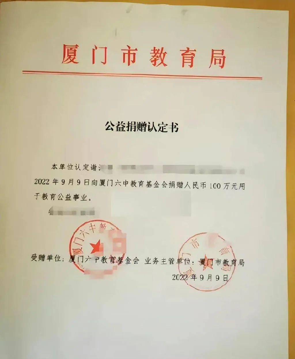 ▼謝先生見保全態度堅定,再理論下去也沒用,於是留了一張紙條就走了,並請保全幫忙轉交給校方長官。但謝先生並沒有接到校方的電話,他一氣之下就將100萬元捐給了隔壁的廈門六中。謝先生曬出一份《公益捐贈認定書》,上面蓋有「廈門市教育局」的章,可信度非常高。