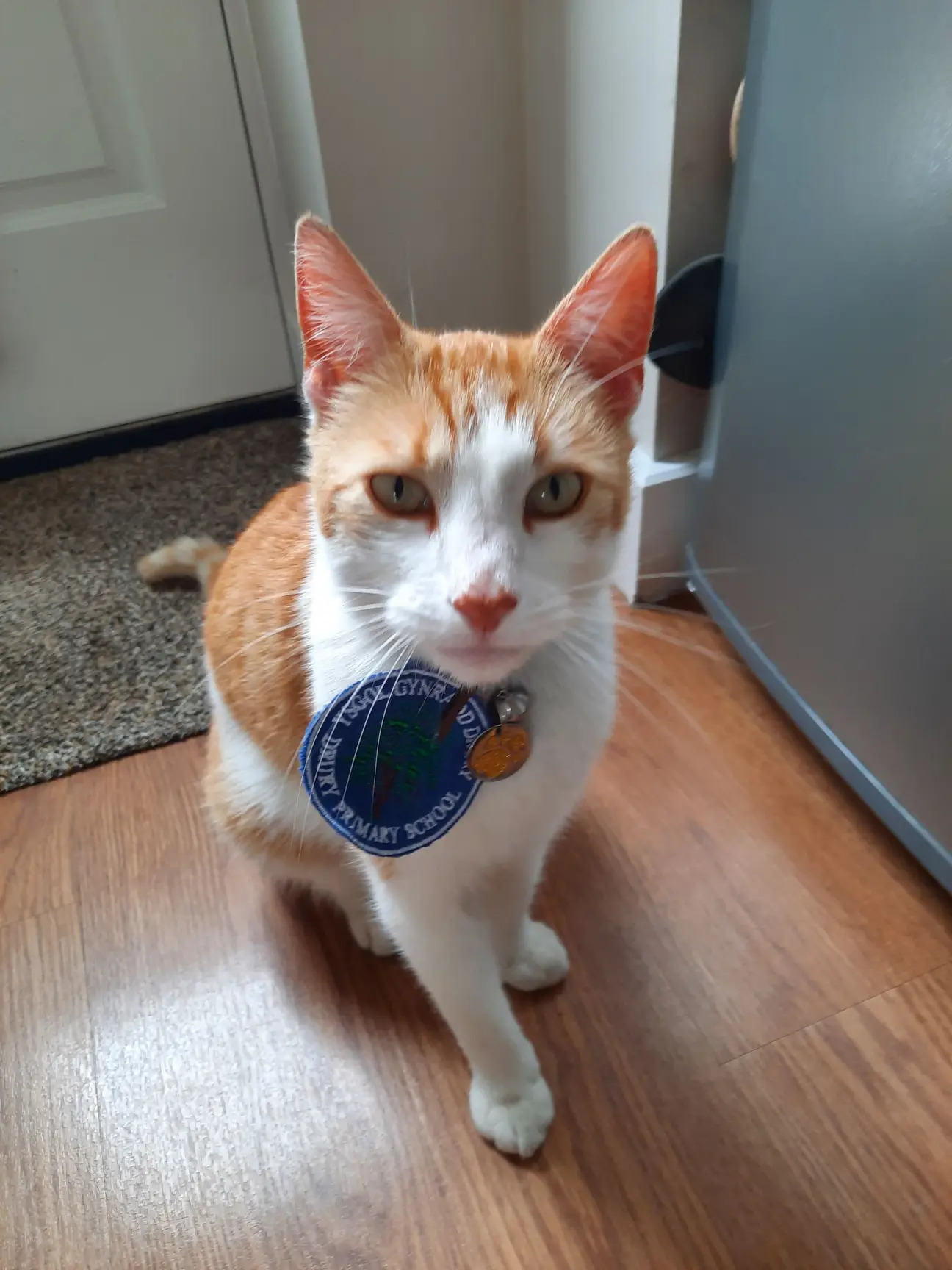 2024年02月13日北威爾斯(North Wales)飼主Emma Roberts養了一隻可愛的貓咪Ziggy,牠經常跟著小主人Megan和Chloe跑到學校玩。有一天學校要給學生們拍照,2個孩子回家時不僅拿著自己的照片,還拿著貓咪Ziggy的照片。只見牠坐在椅子上側身認真盯著鏡頭,好像在擺pose。