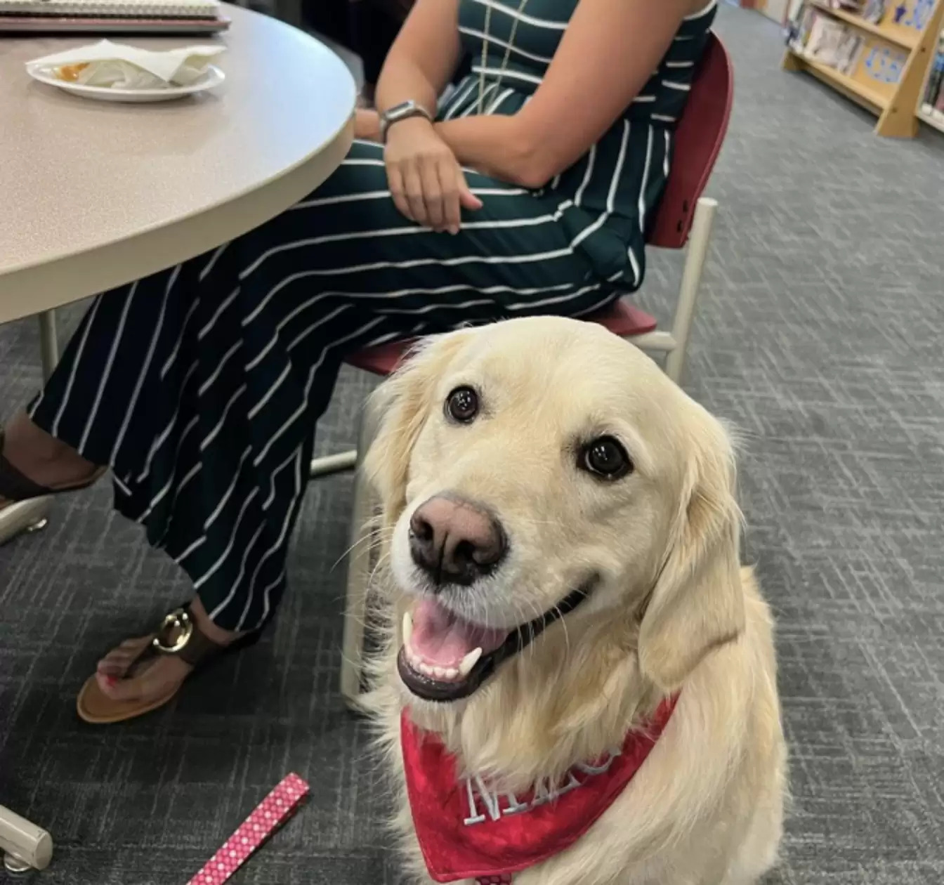 ▼Meg接受過專業的訓練,是一隻非常優秀的治療犬。大約2年前,牠來到了Goshen Middle School。平時七年級數學老師Kelly DeNu負責照顧牠,Kelly說:「Meg的笑容超療癒,牠能將學生們從沮喪的情緒中拯救出來,還能給大家帶來歡樂。」