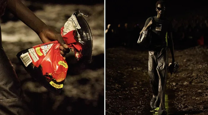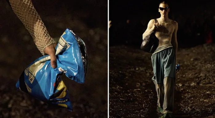 ▼Demna讓模特兒們拿著薯片包走秀。這是巴黎世家與樂事合作推出的包款,共有5種顏色,對應5種不同的口味。外包裝非常擬真,內部則是銀色金屬質感皮革,拿在手上能夠呈現出自然的抓皺效果。