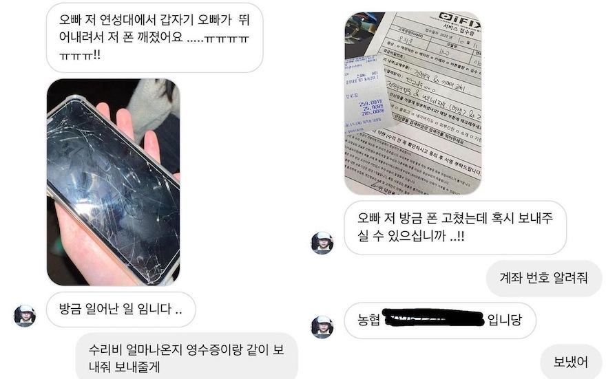 女大生很快傳來收據和明細照片,顯示手機送修共花費28.5萬韓元(約新台幣約6,600元)。UNEDUCATED KID要了他的帳號後,將賠償金轉給了對方。