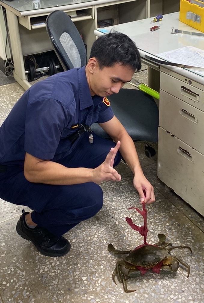 ▼基隆市警察局第三分局碇內派出所13日接獲一個離奇案件,有一對母女帶著一隻大螃蟹到警局求助,表示女兒上班時撿到了一隻在路邊遊蕩的大螃蟹。員警一看也覺得困惑,但他們上網一查就發現,真的有一名黃姓女子在臉書社團發文,表示自己的「寵物蟹」走丟了。