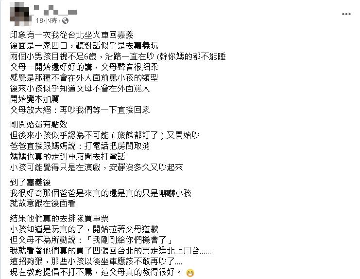 ▼原po表示,自己有一次從台北回嘉義時,在火車上遇到一家四口準備去嘉義玩。當時2個小男孩吵鬧不斷,父母雖然好好講了,但孩子們可能知道父母不會在外面罵人,所以沒有安靜下來,後來還變本加厲。父母警告他們說:「再吵我們等一下直接回家!」