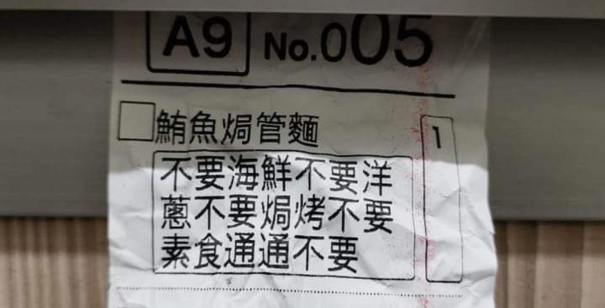 點鮪魚焗管麵備註「海鮮、洋蔥、焗烤、素食通通不要」 老闆崩潰:你要什麼?