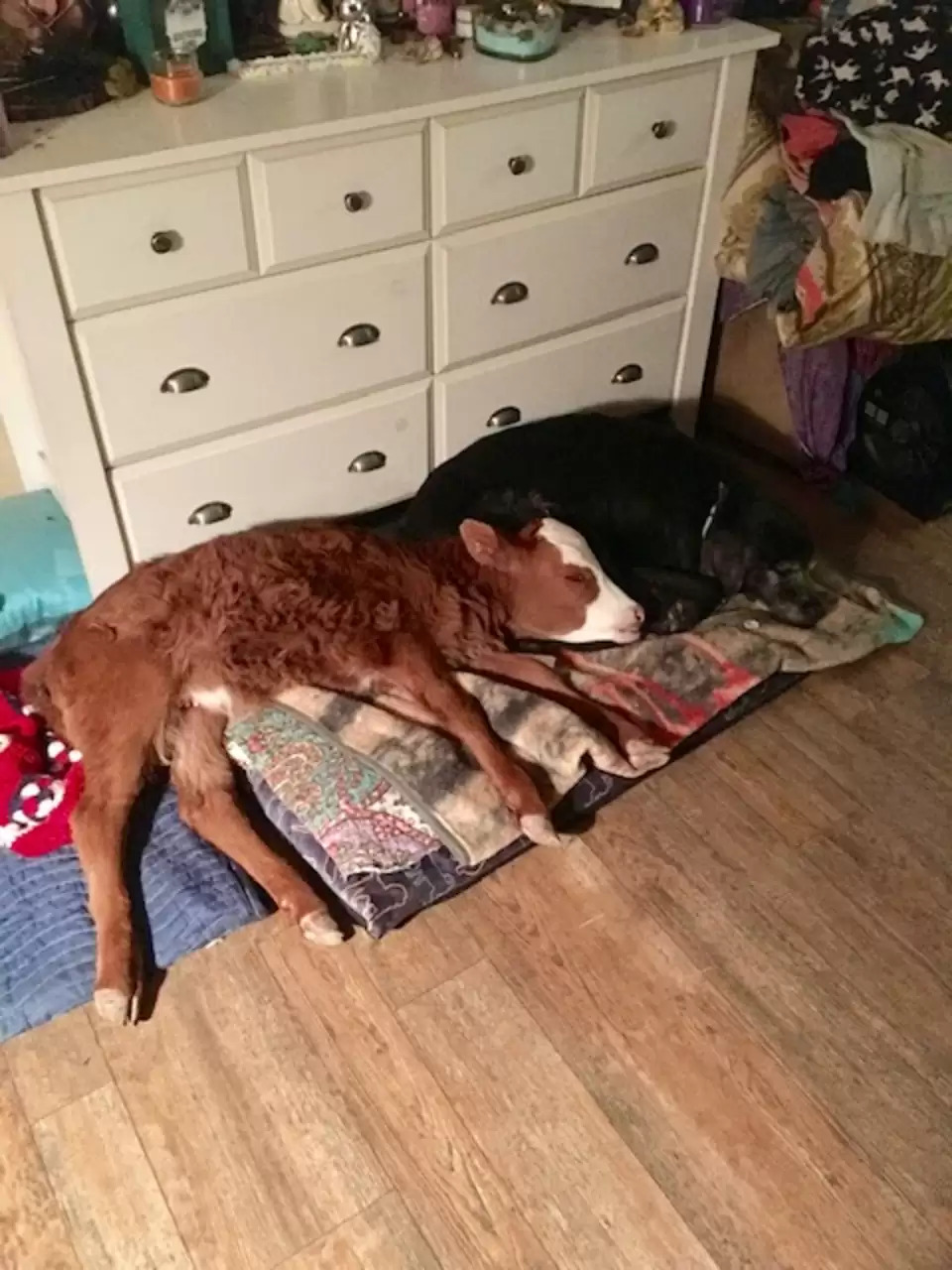 小牛獲救有家「好像以為自己是狗」! 每日「躺狗窩」趴人身上撒嬌:偶還4寶寶~