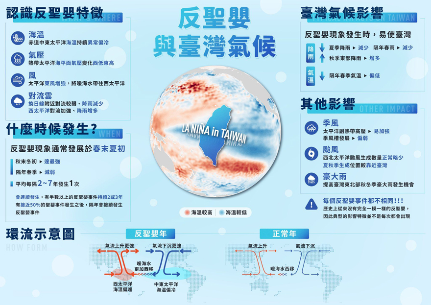 反聖嬰現象通常發生在春末夏初,秋末冬初達到最強,易使台灣夏季降雨減少、隔年春雨減少、秋季東部降雨增多,隔年春季氣溫偏低。並使得西北太平洋颱風生成數量正常略少,夏秋季生成位置會較靠近台灣,且「提高台灣東北部秋冬季豪大雨發生機會」。