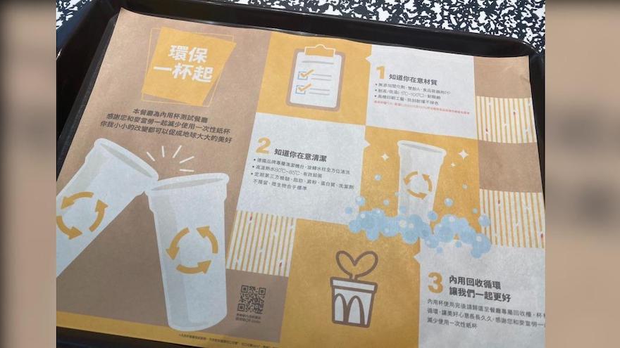 還有麥當勞的員工出門解答:「內用杯目前測試店在台北的某一家店,循環杯北部不知道幾家、台南有3家,未來陸續會增到20幾家循環杯,明年估計會陸續引進內用杯,所以以後麥當勞會有內用杯、環保杯、循環杯」、「之後麥當勞都會改成內有用杯以及外帶杯可以做選擇!內用杯就是由我們內部清洗重複使用」。未來麥當勞會引進洗碗機,將收回的杯子全部丟進去洗。