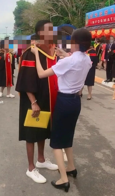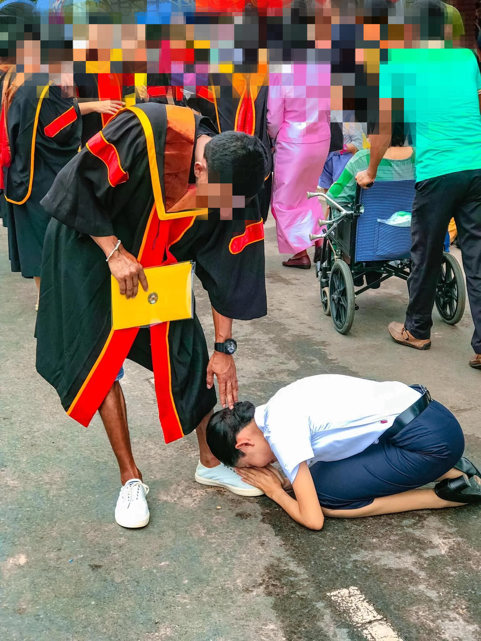 2022年12月06日近日泰國網路上流傳著一組女子向身穿學士服的男子下跪叩拜的照片,引起不少人的關注。後來照片中的女子接受訪問時說,身穿學士服的男子是自己的親哥,會對他下跪叩拜,是因為哥哥把念大學的機會讓給了自己,所以自己畢業時才藉機對他表達感謝。