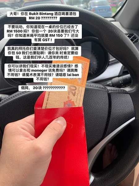 ▼這名新郎在社團「Tarc Confessions」以「大哥,你在XX酒店喝喜酒包RM20?」為題發文,並曬出一張20令吉的紅包照片。他透露,目前一桌的價格約為1500令吉(約台幣10500元),賓客只包20令吉,讓他們虧損很大。紅包的普遍行情為150令吉(約台幣1050元),就算只包50令吉也太少,更何況是20令吉。
