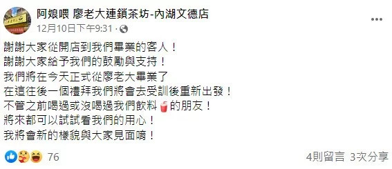 廖老大飲料店台北最後一家分店,內湖文德店於10日在臉書發文說:「謝謝大家從開店到我們畢業的客人!謝謝大家給予我們的鼓勵與支持!我們將在今天正式從廖老大畢業了,在這往後一個禮拜我們將會去受訓後重新出發,不管之前喝過或沒喝過我們飲料的朋友!將來都可以試試看我們的用心,我將會新的樣貌與大家見面唷。」