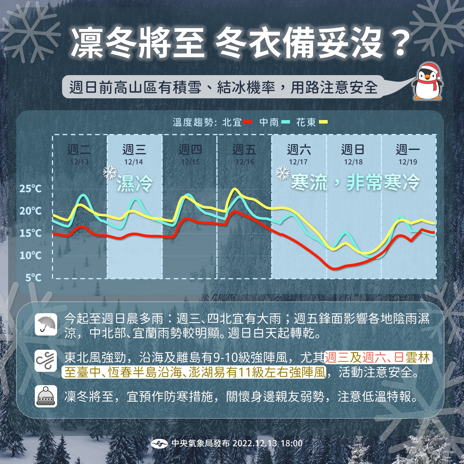 ▼氣象局表示,今年首波寒流將於17日報到,當天「午比晨冷」,傍晚入夜後,中部以北、東北部平地低溫會到10度以下。17日晚間至18日清晨,新竹市體感只有2至3度,台北市體感也只有4至5度,「感受極度寒冷」。
