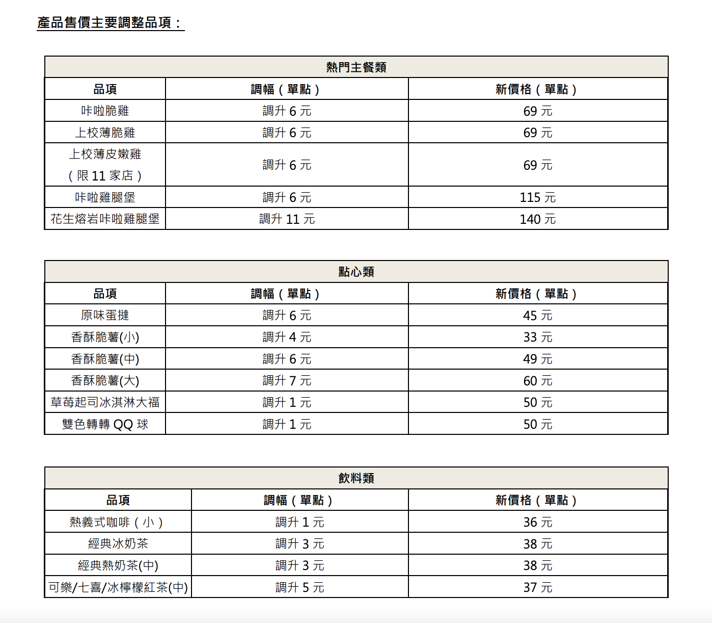 ▼另外,肯德基的飲料價格也有調整。熱義式咖啡(小)調幅1元、奶茶/可樂/冰檸檬紅茶調漲3至5元,其餘部分商品的價格維持不變,包括主餐類2項單點、超值99元雞勵套餐3品項、早餐8品項、點心和飲料4品項。