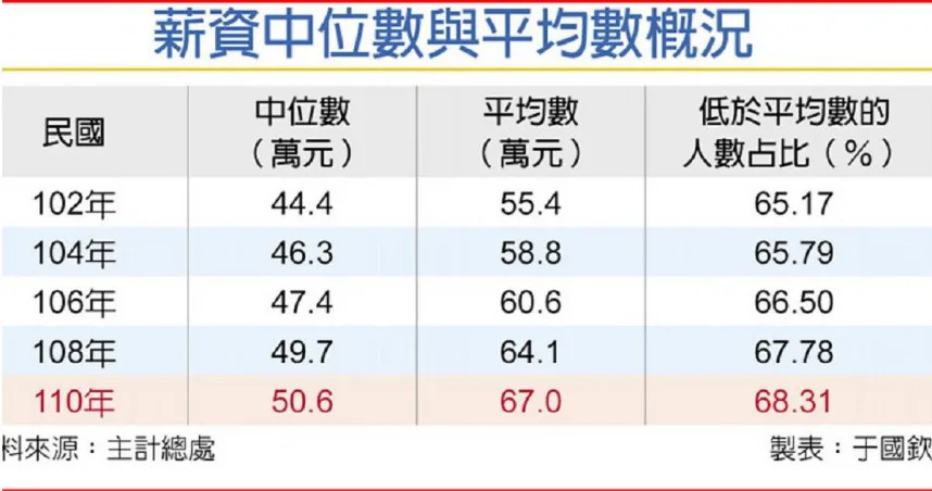 2022年12月22日主計總處21日發布2021年受僱員工全年總薪資統計結果,薪資中位數為50.6萬元,較2020年增加1%,但有68.31%的受僱員工全年收入未達平均總薪資,比例創下歷年新高。這代表中產階層與極端高薪族群的薪資差距持續擴大。