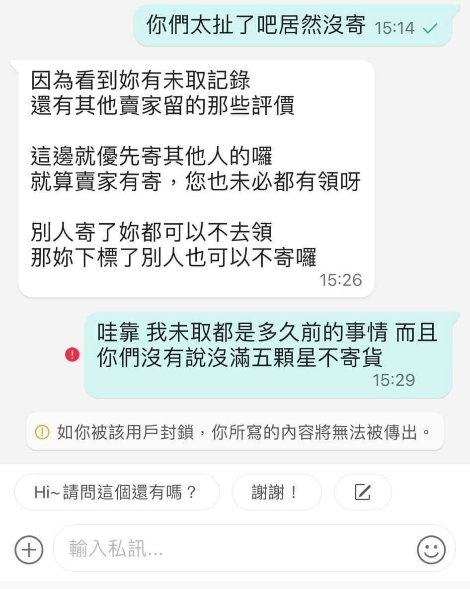 沒想到賣家竟然回:「因為看到妳有未取紀錄,還有其他賣家留的那些評價,這邊就優先寄其他人的囉,反正就算賣家有寄,您也未必都有領呀,既然別人寄了妳都可以不去領,那妳下標了別人也可以不寄囉!」