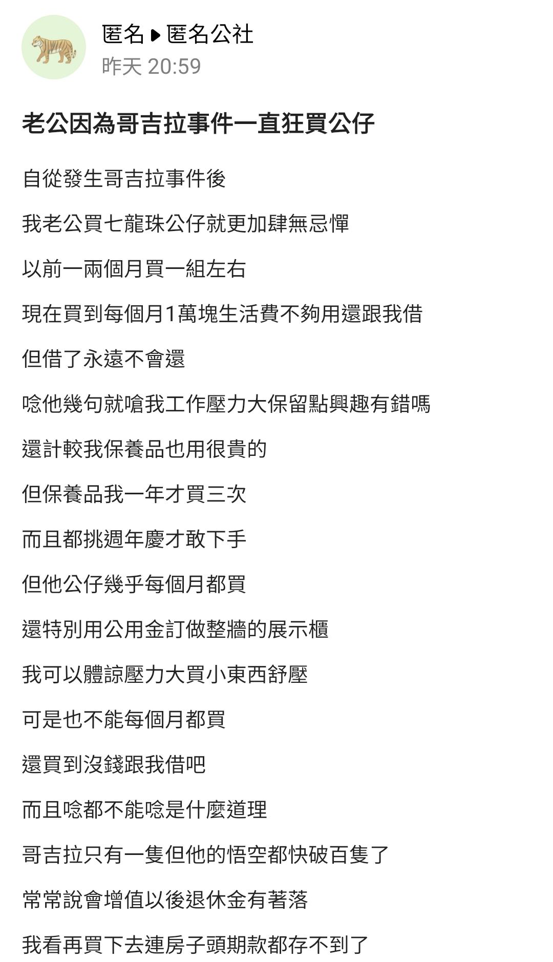 這名人妻在臉書社團「匿名公社」發文說:「自從發生哥吉拉事件後,我老公買七龍珠公仔就更加肆無忌憚,以前1、2個月買一組左右,現在買到每個月1萬塊生活費不夠用還跟我借,但借了永遠不會還。」老公還說,工作壓力大有點興趣錯了嗎?她也有買很貴的保養品。