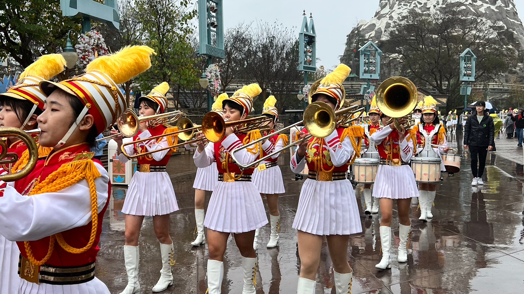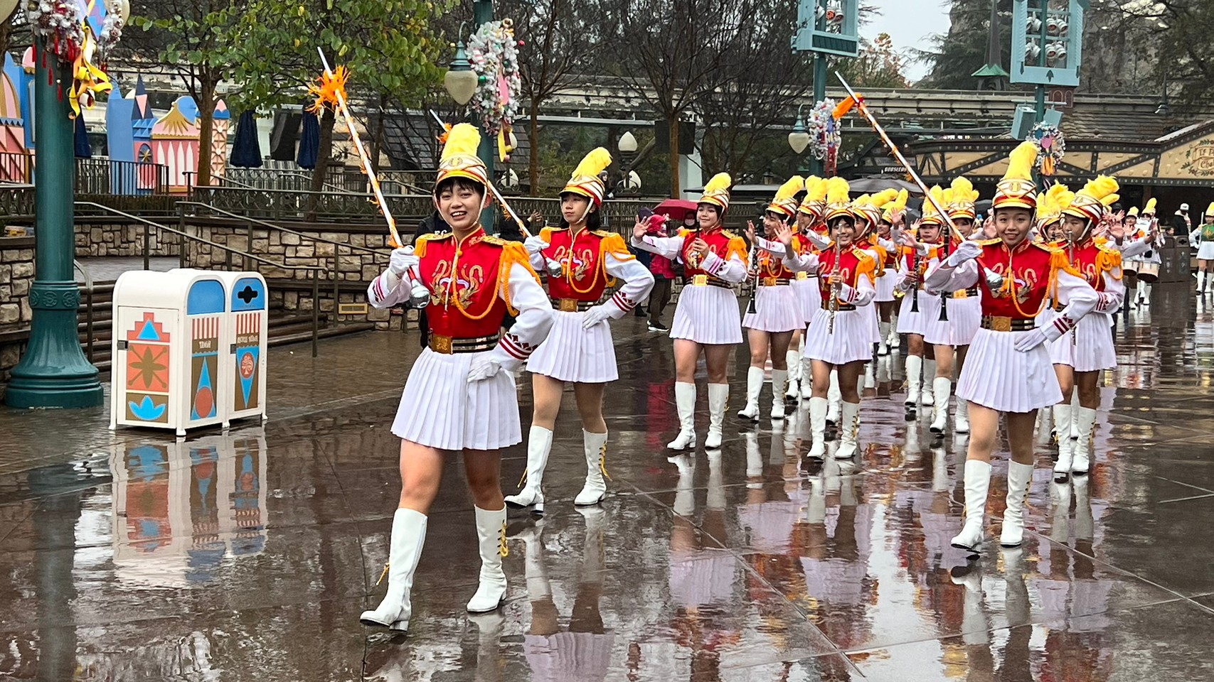 ▼加州迪士尼所在的城市安那罕(Anaheim)4日飄雨,演出前雨勢不小,園方一度考慮取消表演。提早進入園區準備的學生們也非常忐忑,深怕錯過這難得的機會,幸好最後遊行照常出發,學生們也如願完成演出。