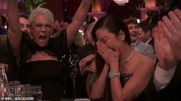 ▼楊紫瓊入行40多年,本次以《媽的多重宇宙》奪下音樂喜劇類最佳女主角。她聽到頒獎人宣布她獲獎時,激動地摀住嘴巴,滿臉不可置信。而坐在旁邊的潔美李寇蒂斯比她本人還興奮,竟將雙手舉高比出勝利手勢,表情更是超誇張。