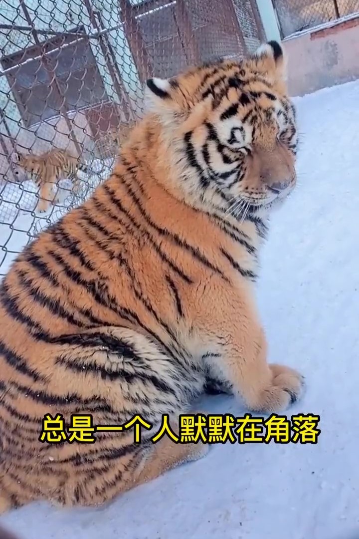 ▼這隻萌萌的小老虎比同伴們都「會吃」,不知不覺間就把自己吃得胖嘟嘟,看起來比其他同伴都要圓潤。先前有遊客到動物園遊玩時,發現牠獨自蹲坐在雪地上,身邊雖然有不少同伴,卻沒有一隻跟牠互動,讓牠超沮喪。