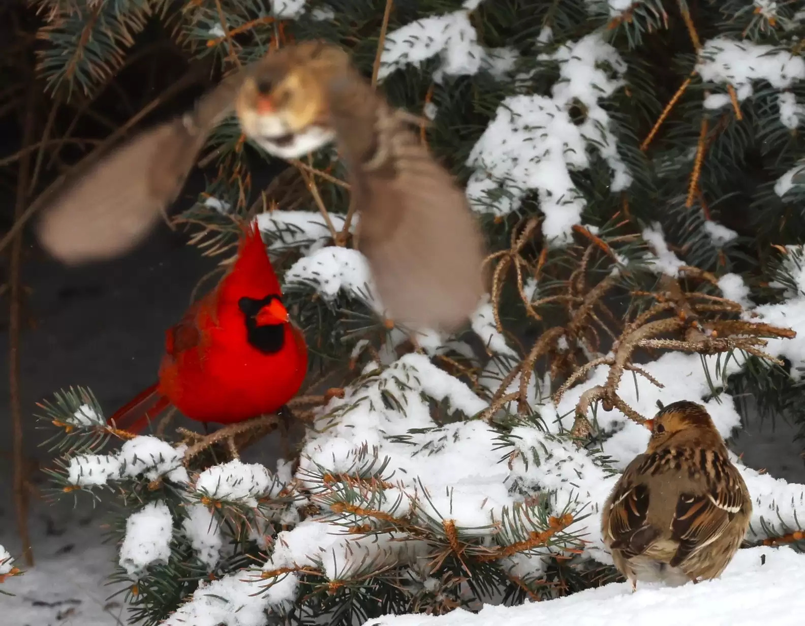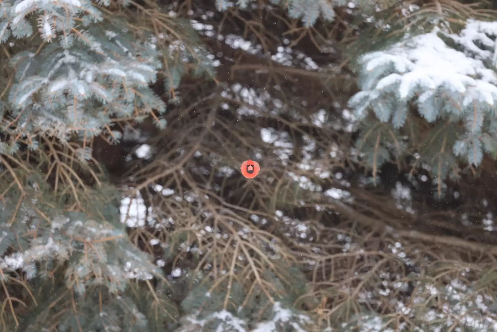 ▼北美紅雀是一種非常活潑的鳥類,牠們不斷在樹枝上蹦蹦跳跳,幾乎不會安靜下來。其中一隻身披紅色羽毛的北美紅雀吸引了Taylor的注意,牠在一眾鳥兒中格外顯眼。