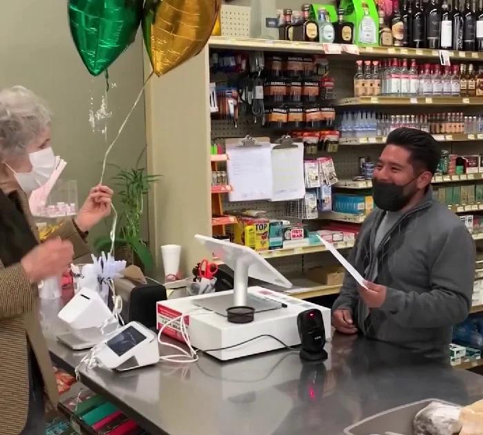 ▼Marion買彩券時跟店員開玩笑說,如果自己中了50萬美元獎金,就分他一半。雖然Marion沒有中得50萬美元,只中了300美元,但她還是遵守承諾,與店員分享。她帶著寫有店員名字的氣球去超商,分給對方150美元,給對方送上驚喜。