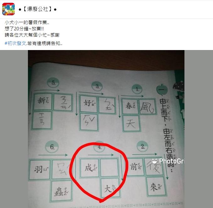 ▼原po求助的是第四題「成X大」,只要找出符合「成X、X大」的字詞就好。原po想了20分鐘也想不出答案,只好上網求救「小犬小一的暑假作業…想了20分鐘~放棄!請各位大大幫個小忙~感謝」。