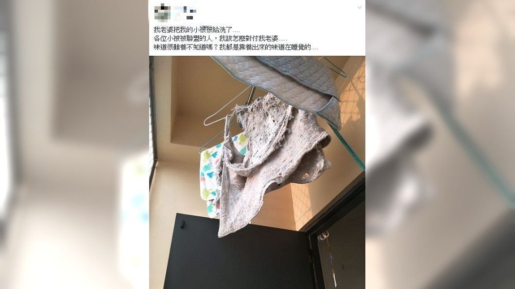 這名男網友在臉書社團「爆廢公社」發文說:「我老婆把我的小被被給洗了…各位小被被聯盟的人,我該怎麼對付我老婆…味道很難養不知道嗎?我都是靠養出來的味道在睡覺的…」