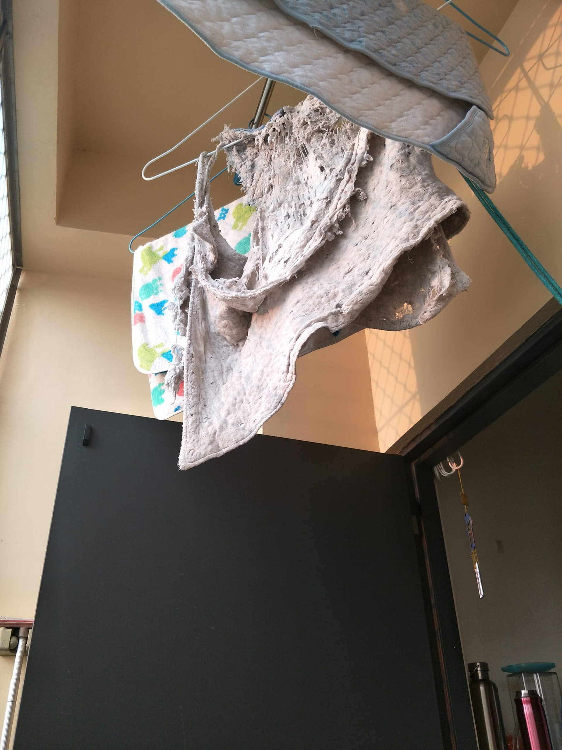 ▼從原po分享的照片可以看到,陽台的衣架上晾曬著一條破舊的小被被。他表示這條小被被是從他的哥哥傳給姊姊,後來又傳到他的手上,至今已經有30多年的歷史了。