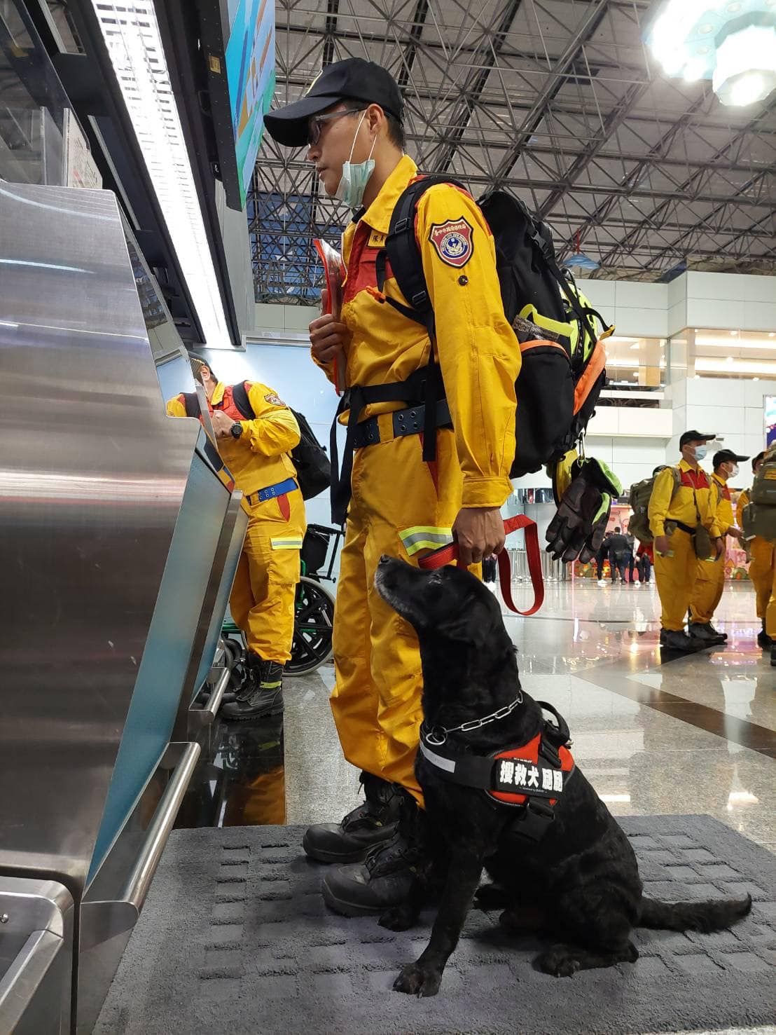 ▼第二批搜救隊是以包機的方式從桃園機場起飛,搜救犬們與領犬員一起坐在商務艙。從照片中可以看到,Melody和領犬員在一起,望著鏡頭露出呆萌的表情;腿腿則乖乖坐在領犬員旁準備登機,已經做好準備迎接即將到來的搜救任務。
