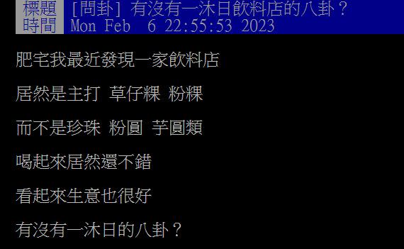 ▼這名網友在PTT上以「有沒有一沐日飲料店的八卦」為題發文,提到他最近發現一間飲料店「一沐日」,主打的配料不是常見的珍珠、粉圓、芋圓等,而是很有「台味」的草仔粿、粉粿。他買來試喝,覺得味道不錯,而且注意到該店的生意也很好。原po問:「有沒有一沐日的八卦?」