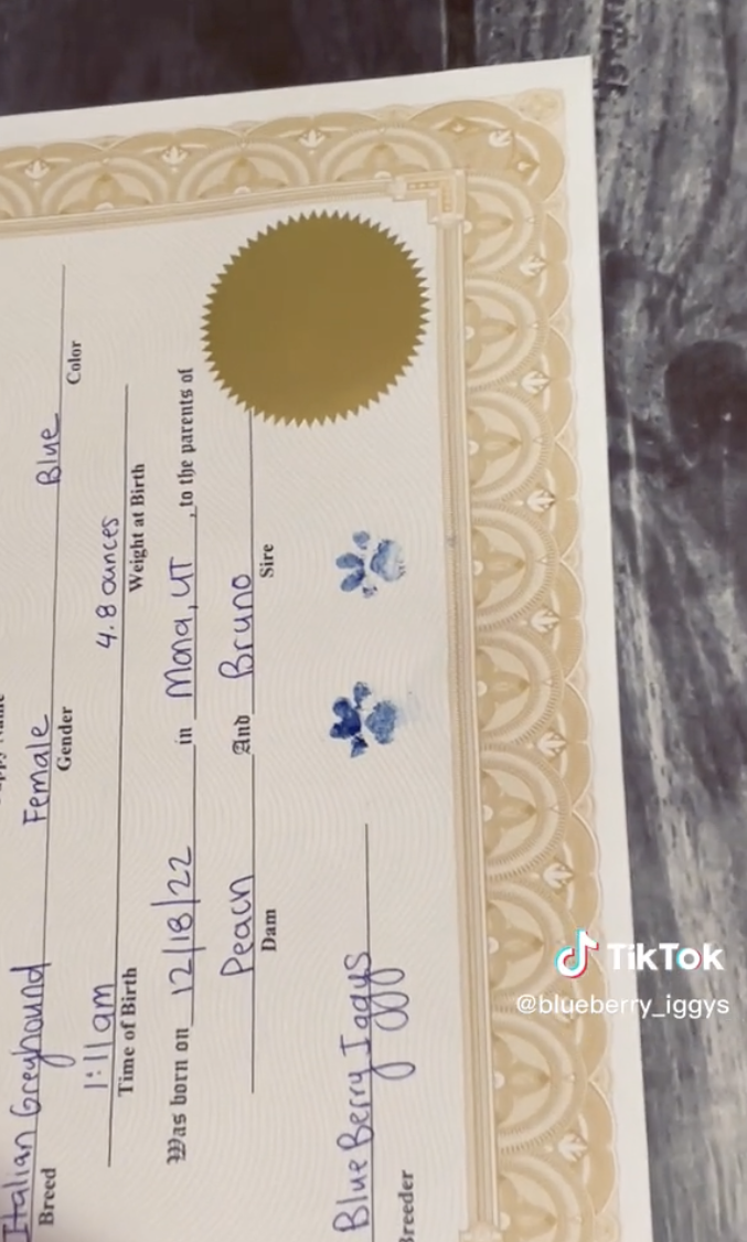 ▼狗狗在出生證明上按下藍色的迷你爪印,以後不論誰得到這張出生證明,都有義務要照顧狗狗到終老,讓牠過得安穩幸福。
