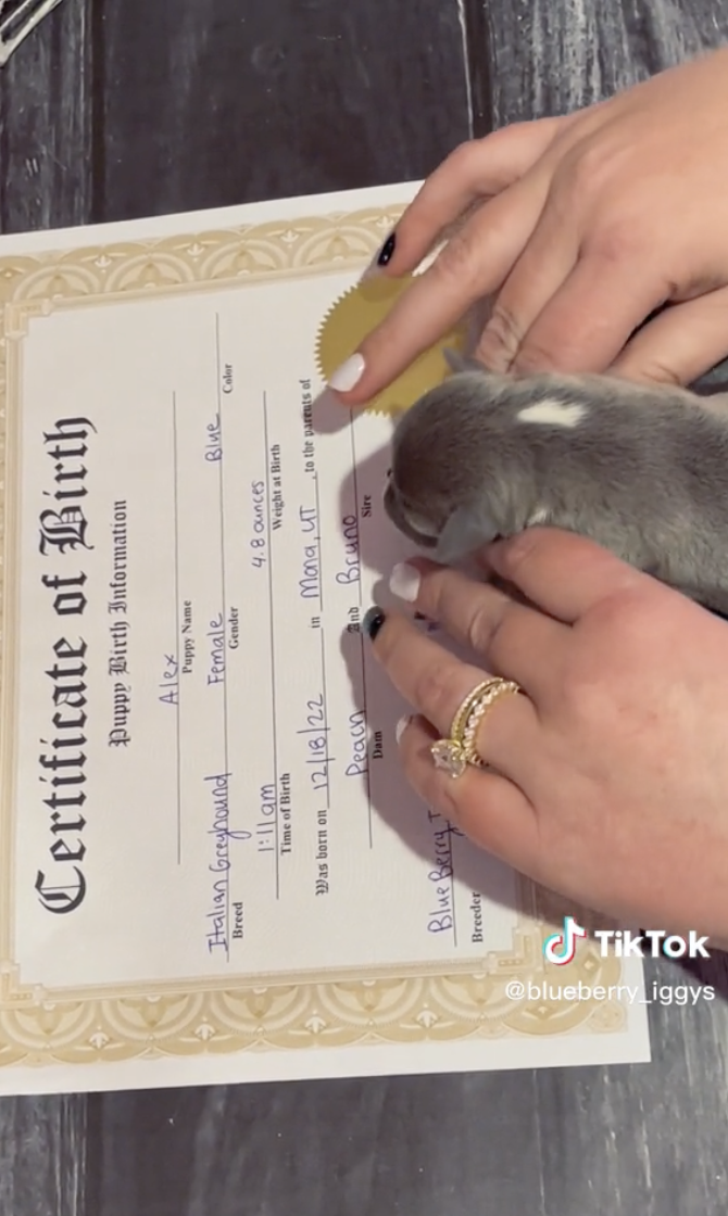 ▼狗寶寶們出生後,飼主讓小奶汪們在出生證明上按下爪印,就像蓋章一樣的概念,當小手印完整印在紙上,就算完成手續,正式成為家中的一員。從影片中可以看到,飼主抓著狗寶寶的小手,輕輕按在紙張上,那萌萌的肉球印章實在太萌。