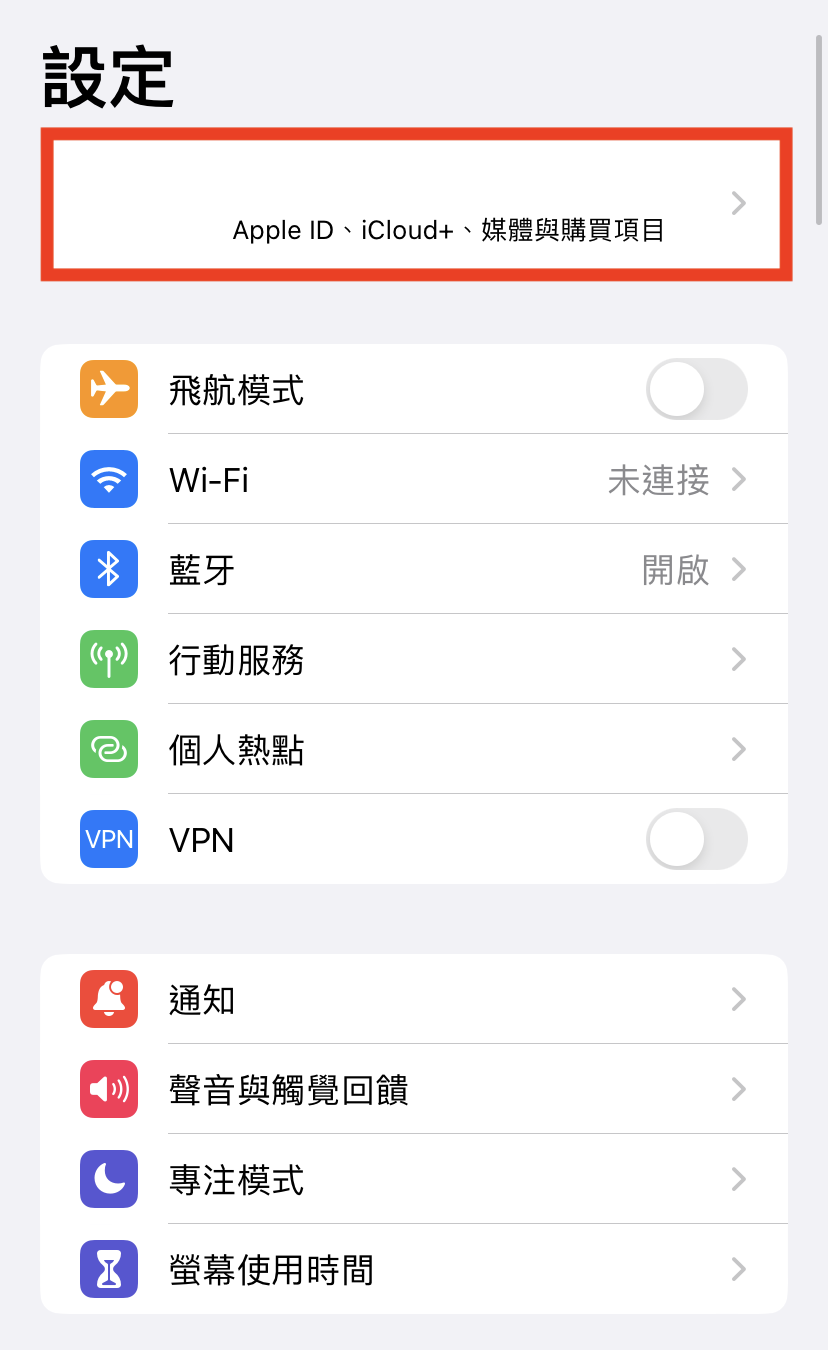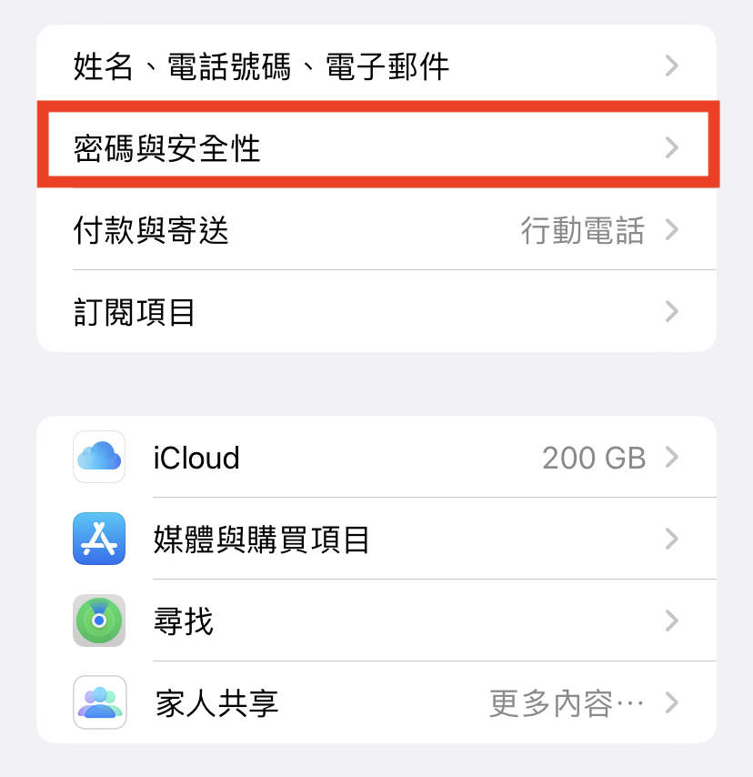 ▼1.開啟iOS「設定」,點選「Apple ID 帳號」,選擇「密碼與安全性」。